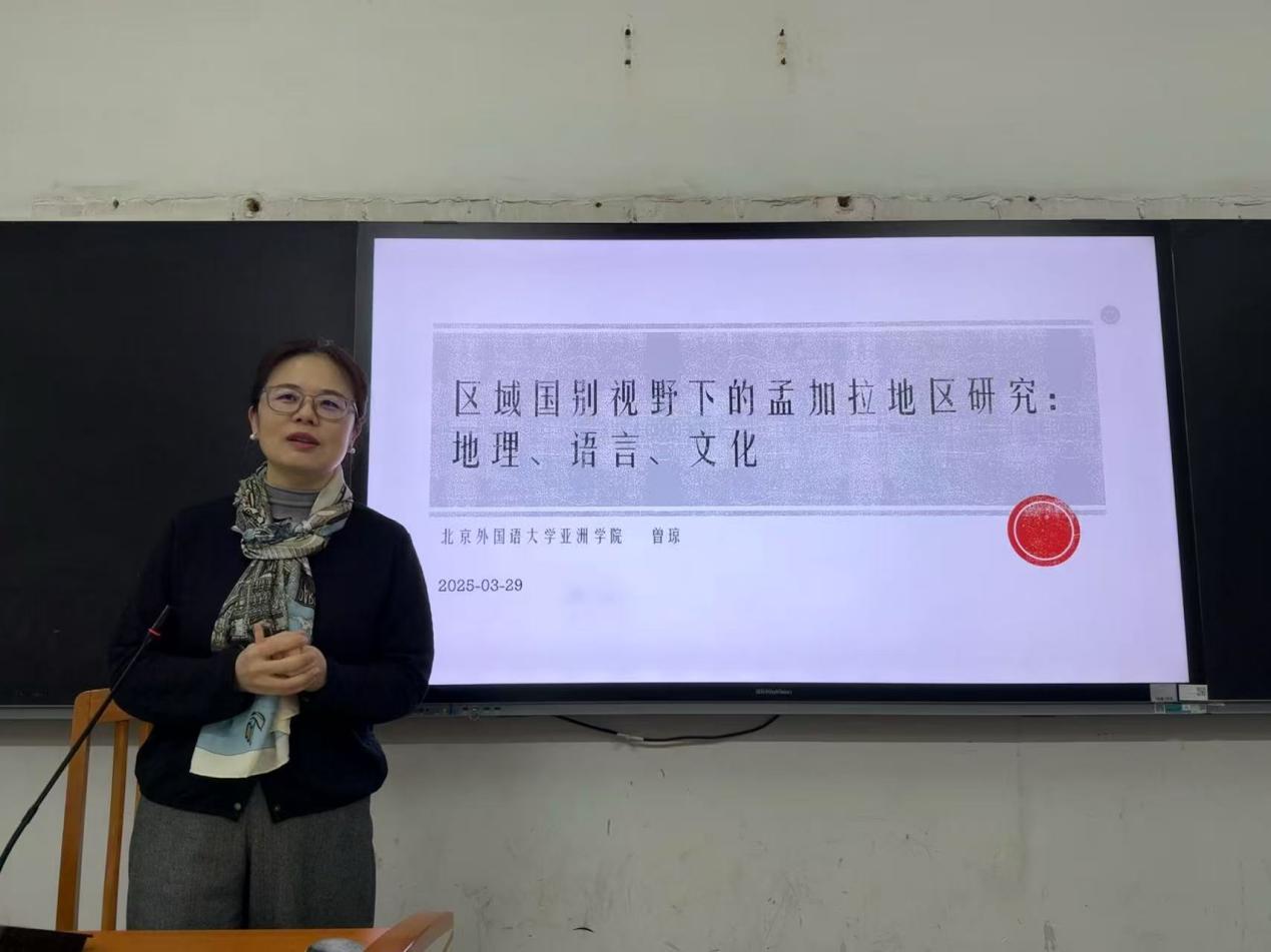 讲座中,曾琼教授以孟加拉语的历史嬗变为叙事主线,结合大量图文史料与田野调查案例,生动展现了孟加拉语的丰富文化内涵。曾教授特别强调,作为南亚次大陆文明交融的典型样本,孟加拉地区研究对于理解南亚地缘政治、跨文化传播以及“一带一路”人文交流具有特殊学术价值,这一观点为在场师生提供了全新的研究视角。