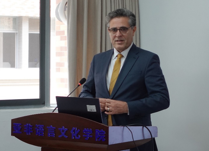 活动伊始,卡里尔·哈什米大使发表讲话。大使强调了中巴两国之间深厚的友谊,表示国际形势风云变幻,但无论面对何种情况,中国与巴基斯坦始终是铁杆朋友,中巴关系是双边关系的典范。通过向现场师生讲述中巴关系史上两国守望相助的事迹,大使展示了中巴关系深厚的历史基础。大使还表示,广州与巴基斯坦的拉合尔是姐妹城市,双方有着开展合作的良好基础,广州直飞拉合尔航线的开通仅仅是一个开端,未来一定会诞生更多成功的合作范例。在讲话最后,大使特别强调了乌尔都语在中巴交流与交往中的独特作用,鼓励乌尔都语专业员工,在今后为推动中巴两国各领域的合作与发展贡献自己的力量。