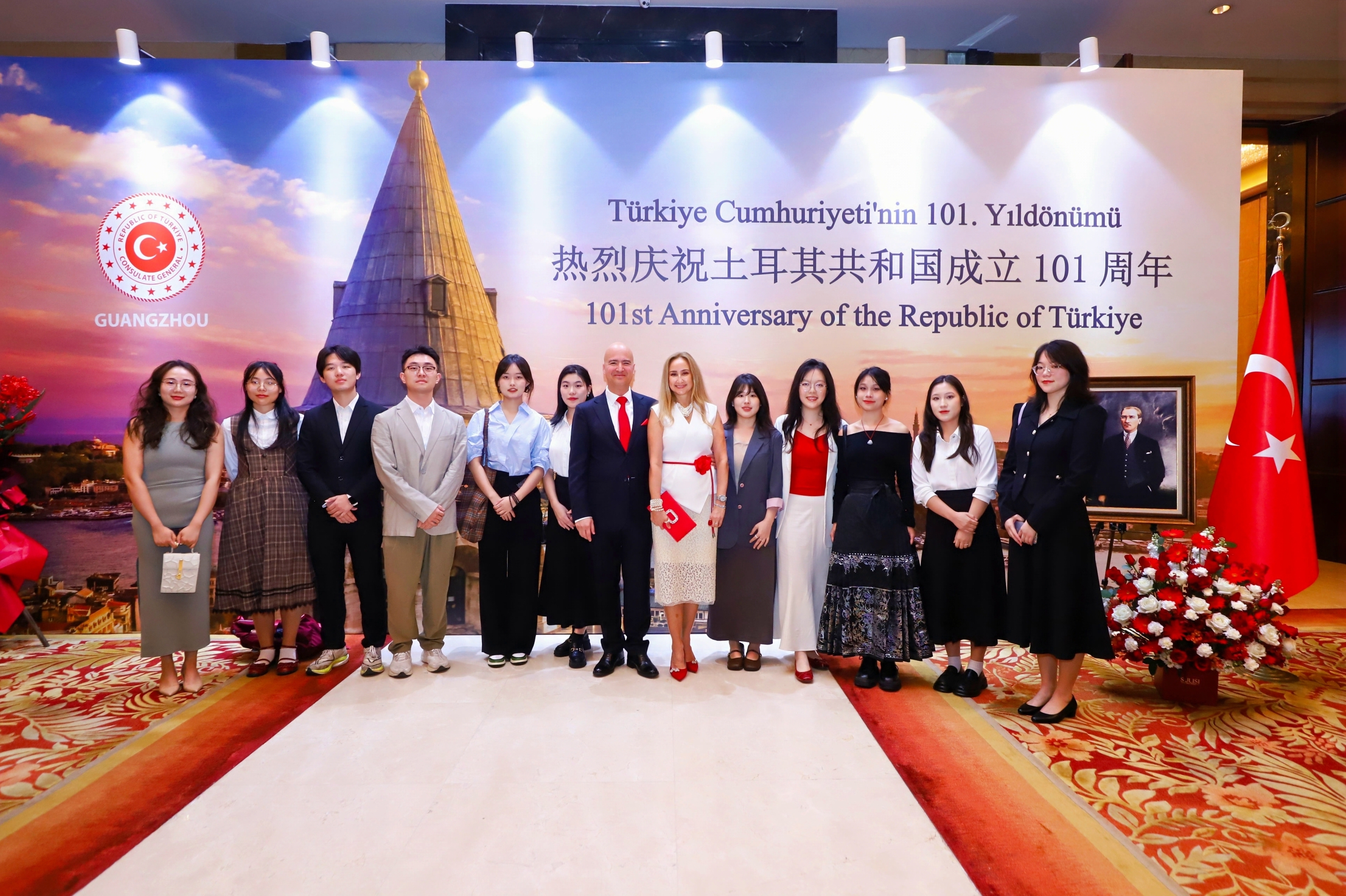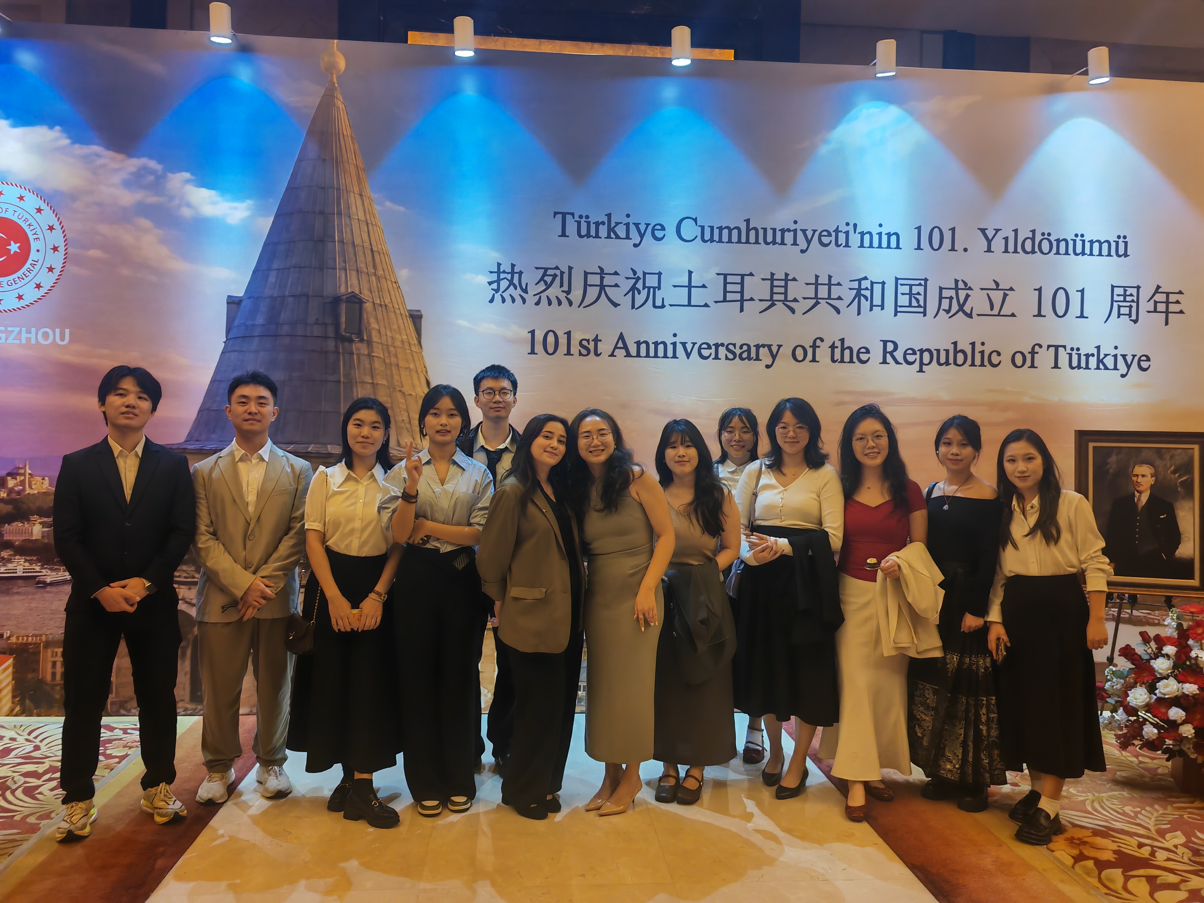 2024年10月29日晚,bevictor伟德官网土耳其语系专业负责人黄嘉玲及外教马雨洁(Tugce Sargin Ma)带领大四年级11位本科生应邀出席了由土耳其共和国驻广州总领事馆举办的土耳其共和国成立101周年国庆招待晚宴。