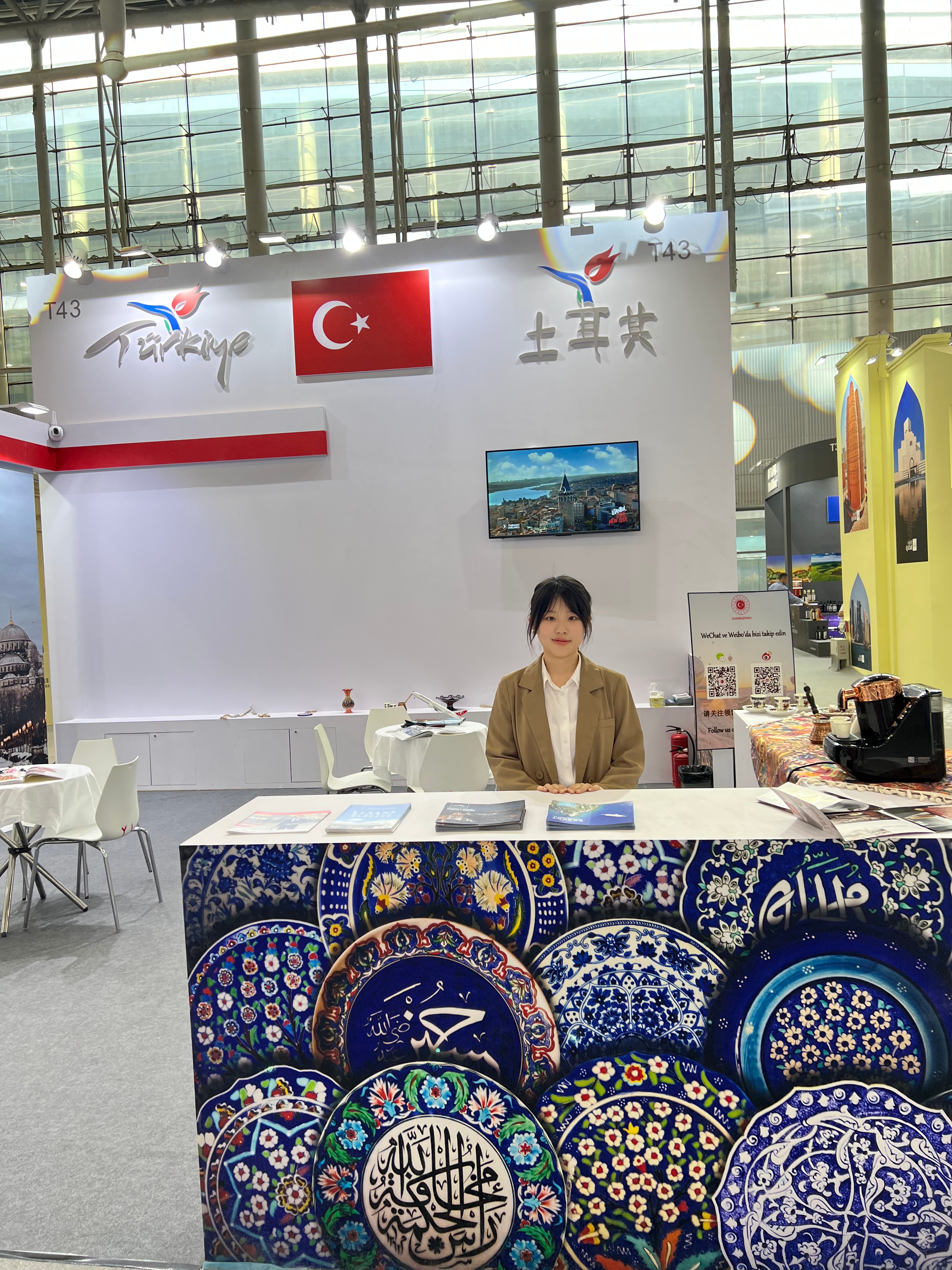 王紫熙:在工作期间,我印象最深刻的就是为参展者制作土耳其咖啡,并介绍制作方法,为大家答疑解惑,这种忙碌充实感让我享受其中。大家对“蓝眼睛”也很感兴趣,好几个人说去土耳其旅游的时候会买几个当作手信,展区氛围其乐融融,此次博览会是个开放的舞台,是让大家邂逅土耳其独特魅力的机会,对我来说也是很愉快的一次体验。