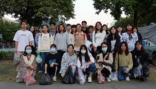 发展对象第二小组成员在北校区体育公园石牌前集合完毕后,统一在篮球场与网球场四周进行清洁工作。发展对象成员们按要求自备垃圾袋,围绕运动场自觉清理草丛中与校道上掉落的瓶盖、包装纸等垃圾,并根据垃圾收集分类规范放入了垃圾桶。