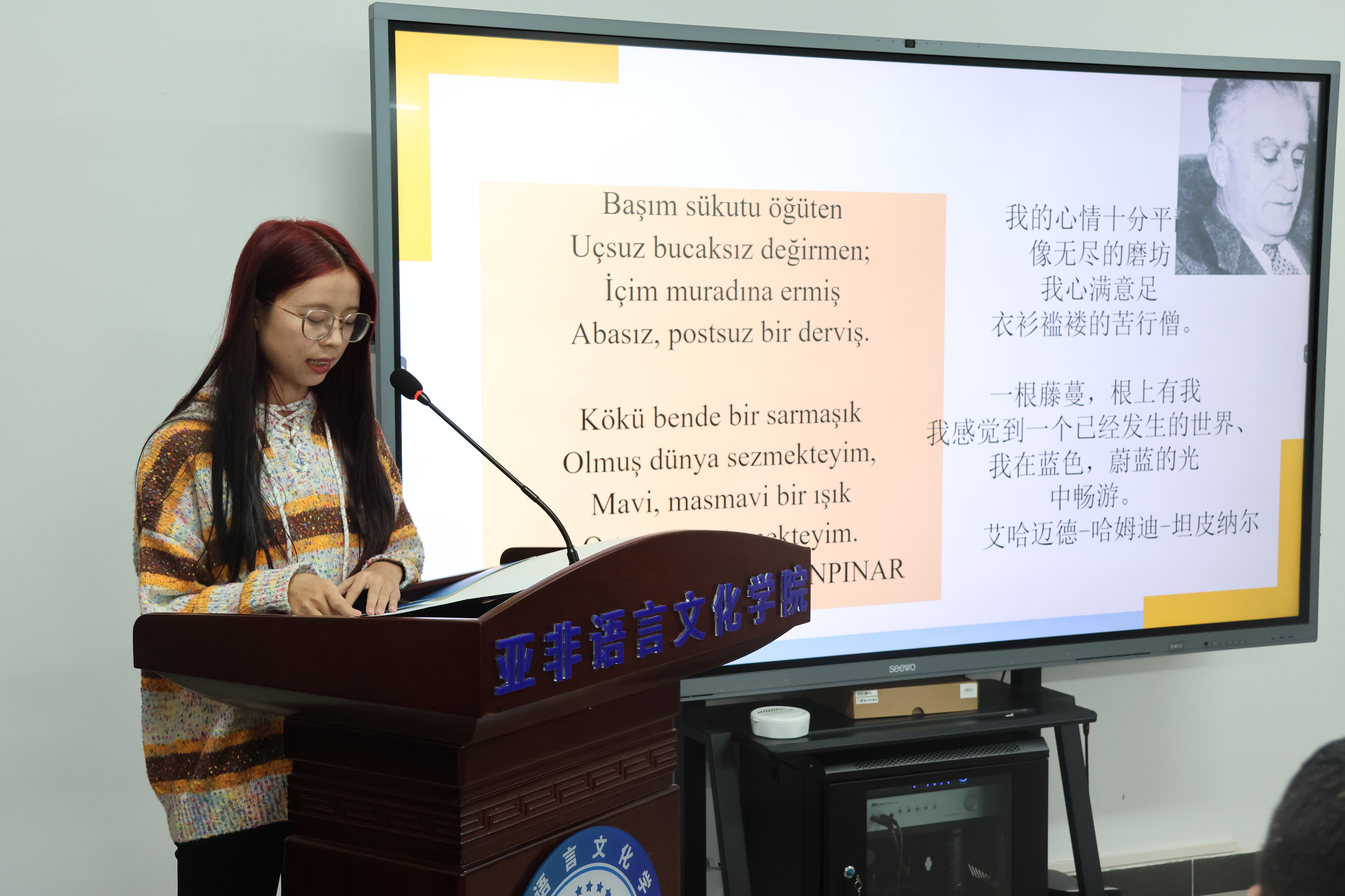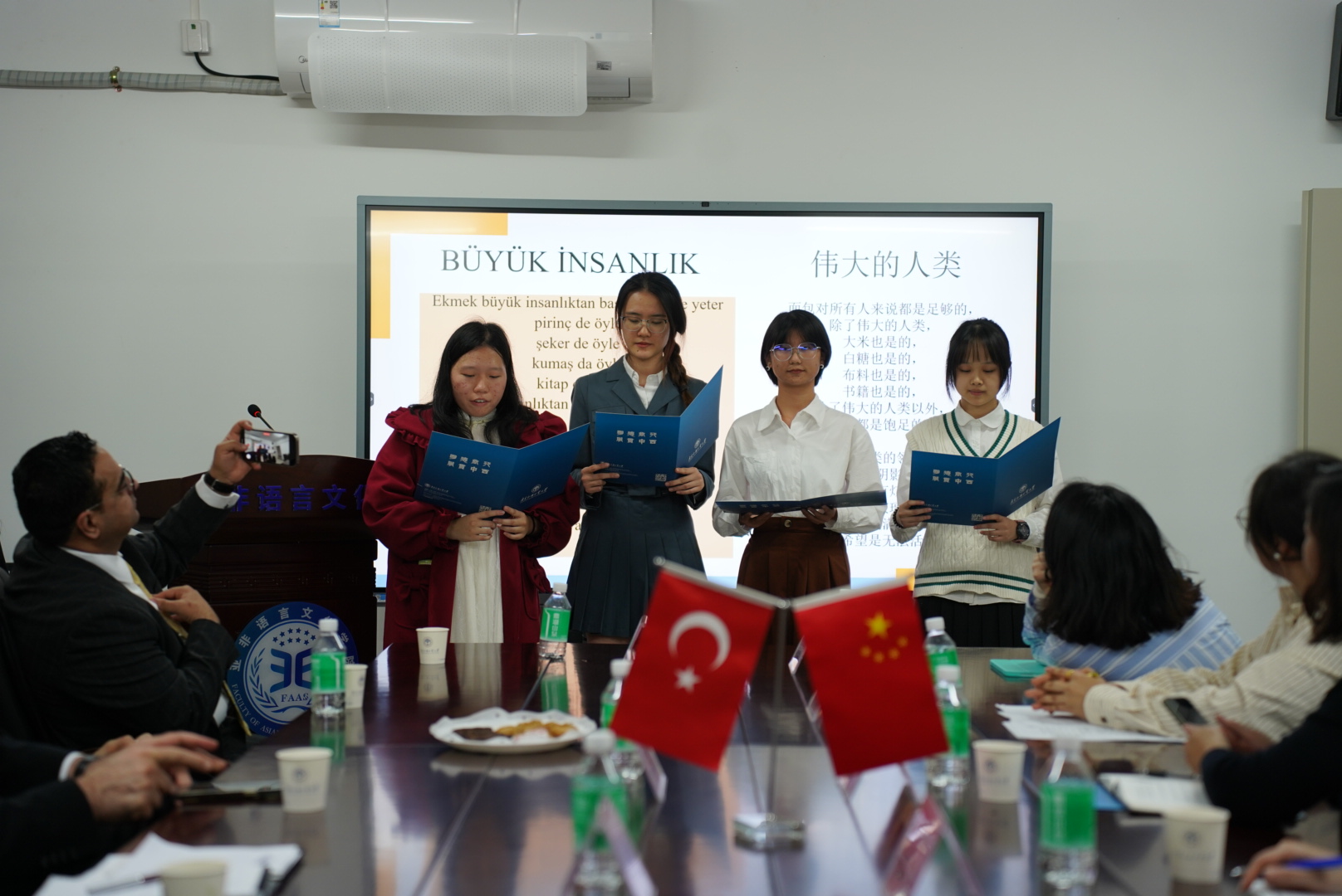 交流活动中,土耳其语专业的员工们精心准备了风采展示和诗朗诵表演,已经走出校门、分布在世界各地的员工积极参与视频拍摄,通过视频表达了对大使的热烈欢迎以及对母校的深深祝福。他们用自己的语言和微笑展示了广外土耳其语系学子在学习过程和国际舞台上的自信和魅力。在校员工代表们还和大使一行分享了土耳其语专业相关的丰富多彩的文化、学术和志愿者活动。大使先生在交流过程中对员工们的表现频频点头称赞。土耳其语专业学子的风采得到了大使一行的充分赞扬与认可。