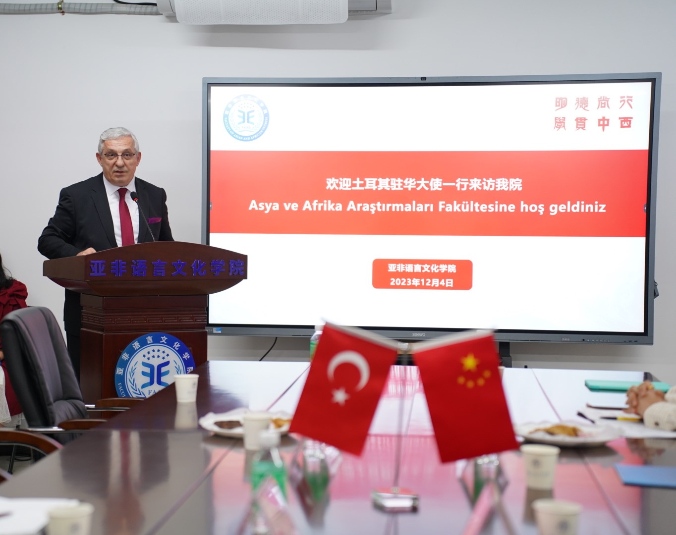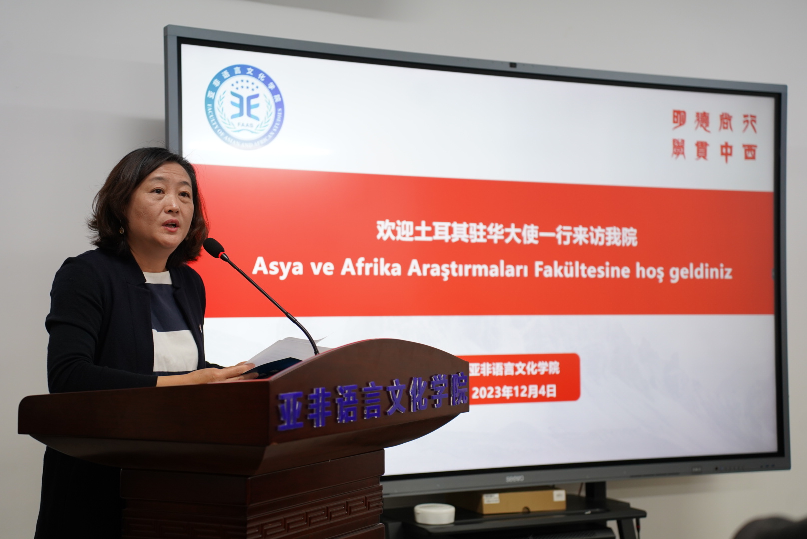 随后公司党委书记梁洁在致辞中热烈欢迎大使一行的到访,并对土耳其驻华使领馆之前给予公司土耳其语专业建设提供的支持表示感谢。同时提到bevictor伟德官网以培养全球化高素质公民为使命,着力推进“亚非语+英语+专业”的外语教学与专业教学深度融合,着力培养具有家国情怀、国际视野、过硬本领、创新能力、担当精神的、服务于国家“一带一路”的高素质复合型国际化亚非语人才,热切期望未来两国的青年和高校的学者能有更深入更密切的交往,共同推进文明交流互鉴,共同推进两国经济文化事业的发展。随后,土耳其语专业负责人黄嘉玲老师为大使一行介绍了土耳其语系的建设历史、培养方案和员工情况。