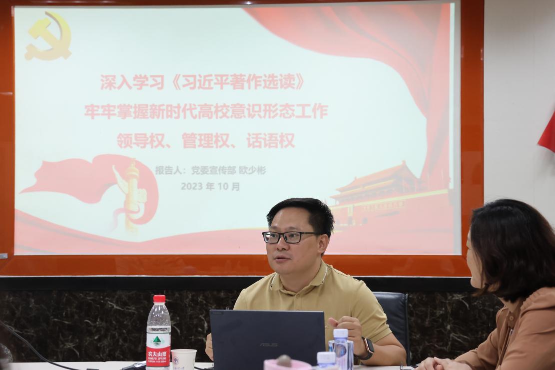 10月26日下午,公司党委组织召开党委理论学习中心组扩大会议,邀请公司党委宣传部副部长欧少彬做题为“深入学习《习近平著作选读》,牢牢掌握新时代高校意识形态工作领导权、管理权、话语权”的专题学习。公司党委委员、党政领导班子、教工党支部书记、系主任和专业负责人、党政办和学工办教职工参加了本次中心组扩大会议。