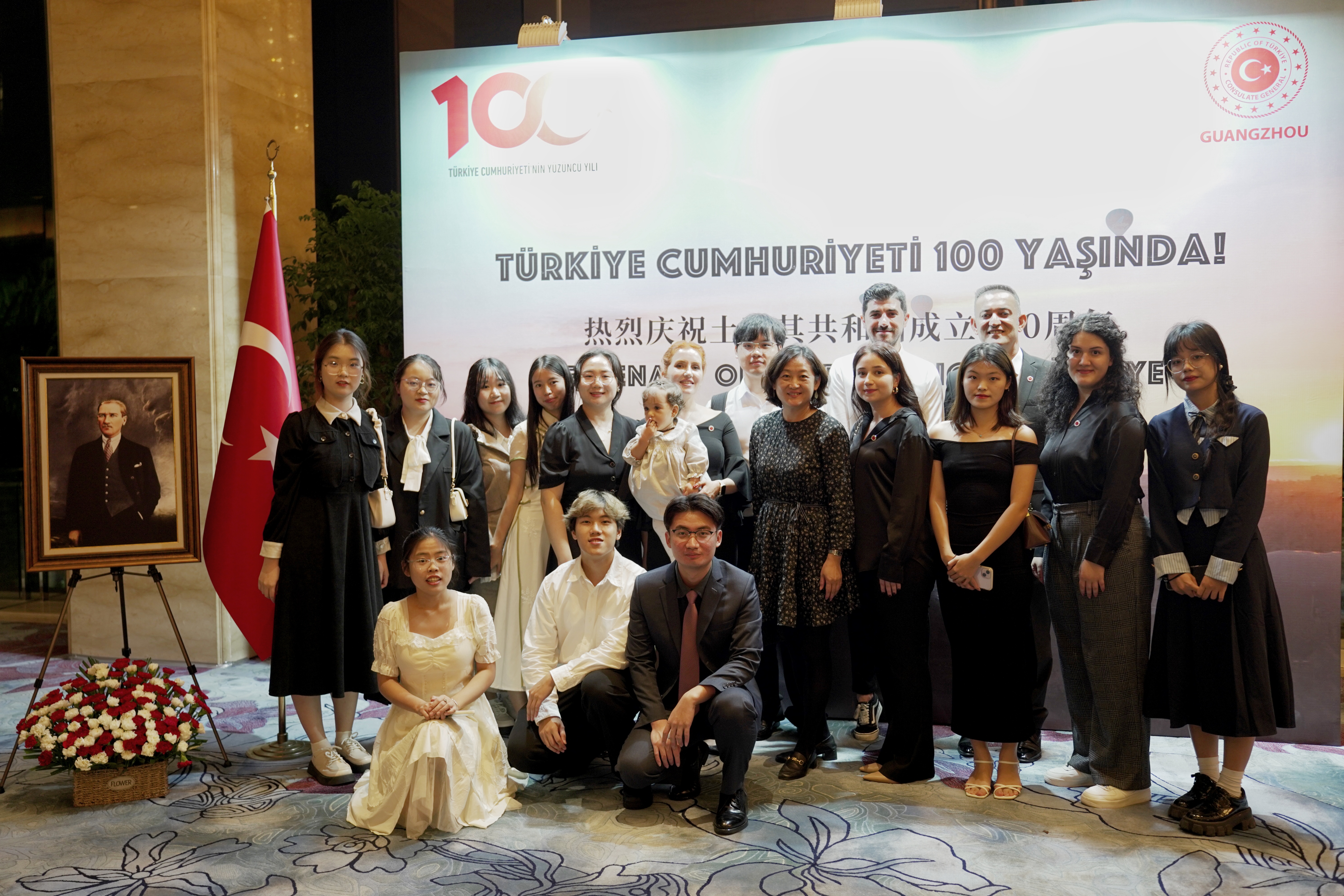 2023年10月30日晚,亚非语言文化公司党委书记梁洁、土耳其语系专业负责人黄嘉玲及教师李诗晴、外教布兰特·奥兹坎、艾察·查拉阳·奥兹坎带领大四年级共11位本科生应邀出席了由土耳其共和国驻广州总领事馆举办的土耳其共和国建国一百周年国庆招待晚宴。
