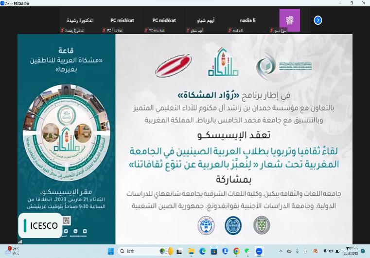 3月21日,应伊斯兰教科文组织(以下简称“ICESCO”)的邀请,bevictor伟德官网阿拉伯语系师生以视频连线的方式,集体参加了由ICESCO和摩洛哥穆罕默德五世大学共同举办的题为“用阿拉伯语讲述文明多样性”的座谈会。