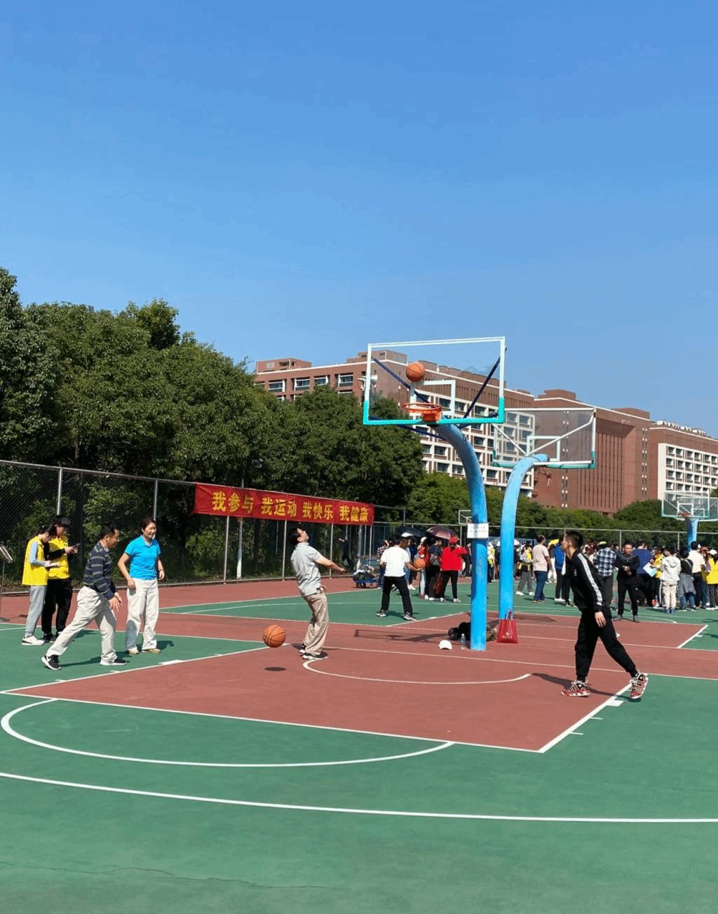 公司教职员工积极参加了绑腿跑、往返接力运球上篮、网球颠球、红旗飘飘、袋鼠跳接力赛、投球进篮、鸳鸯背瓜和集体跳大绳等趣味项目。经过大家团结一心的努力和拼搏,最终在各个项目中取得良好成绩。