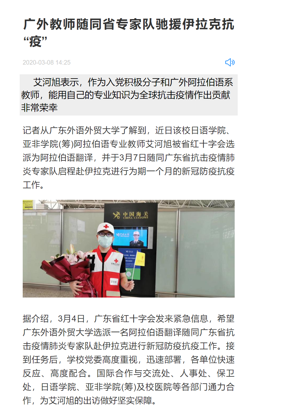 疫情无国界,2020年3月7日,公司阿拉伯语教师艾河旭被省红十字会选派为阿拉伯语翻译,随同广东省抗击新冠肺炎疫情专家赴伊拉克进行新冠肺炎抗疫工作,“青山一道,同担风雨”,彰显了广外人大爱无疆的抗疫精神。新华社、南方Plus、南方都市报、广州日报等多家媒体对本次抗疫工作进行了报道。