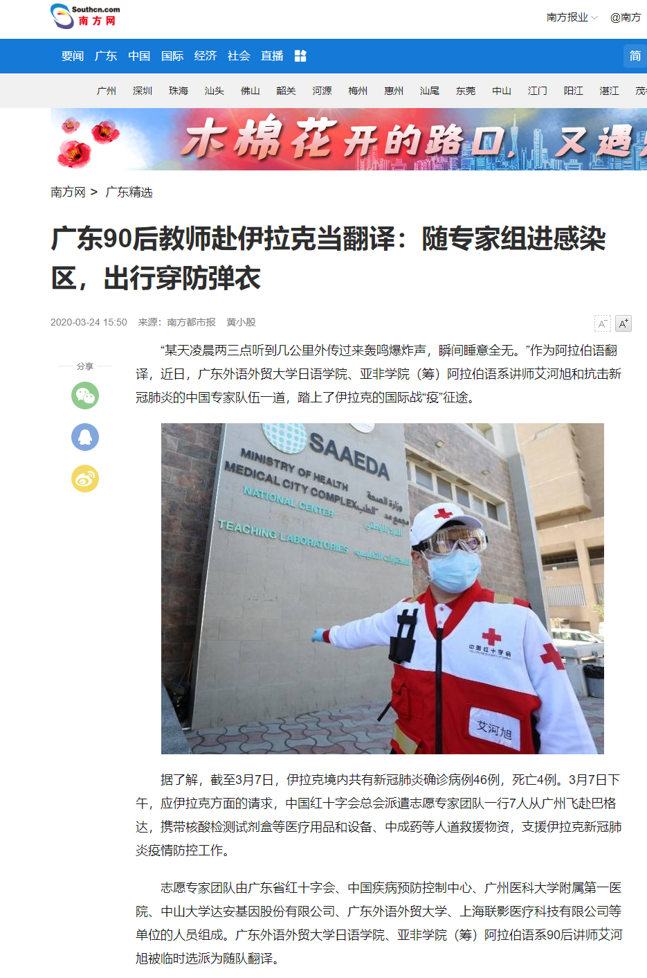 南方都市报:广东90后教师赴伊拉克当翻译:随专家组进感染区,出行穿防弹衣http://news.southcn.com/gd/content/2020-03/24/content_190637726.htm