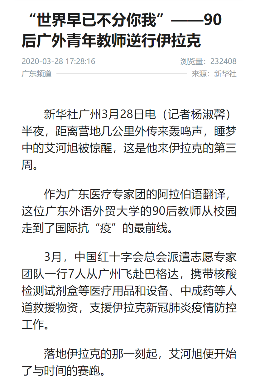 新华社:“世界早已不分你我”——90后广外青年教师逆行伊拉克