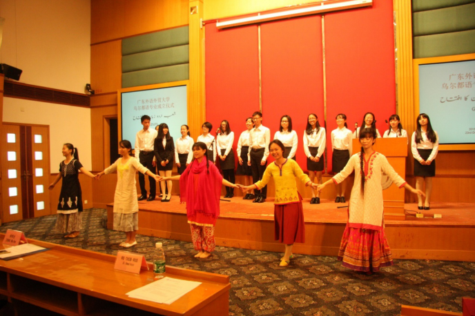 最后,仲伟合与阿里·艾哈迈德·阿拉因及东语公司相关领导一起为乌尔都语专业揭牌。揭牌后,乌尔都语专业的新生献上了具有浓厚巴基斯坦风情的歌舞表演。