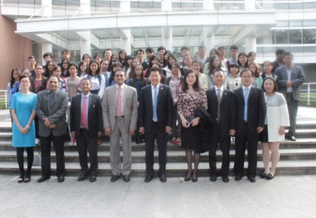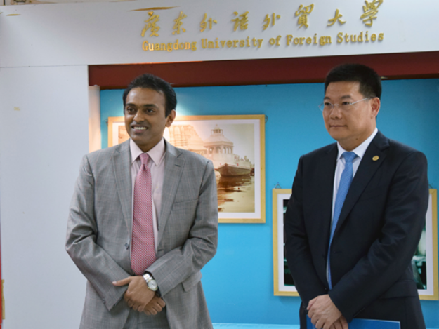 本网讯 11月20号下午,印度文化图片展开幕式在图书馆一楼通识平台举行。印度驻广州总领事馆总领事高志远(Mr.K.Nagaraj Naidu)、文化与教育领事迪拉吉·慕琦亚(Mr. Dhiraj Mukhia)、领事塔润·库玛(Mr.Tarun Kumar)一行到访公司,公司董事长仲伟合亲切地会见了来宾,并共同宣布此次图片展开幕。陪同会见的有国际交流与合作处处长蔡红、副处长吴俊峰、印地语系教师胡瑞、田克萍等。印地语系全体员工出席了开幕式。