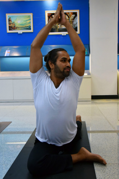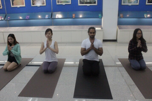 仲董事长的发言结束后,来自印度瑜伽圣地——瑞斯凯诗的瑜伽大师Deepak为大家带来瑜伽表演。在董事长和老师们的鼓励下,三位同学也一同参与了瑜伽体验。伴随着音乐,Deepak带领着三位同学放松身心,走进瑜伽的世界。追求宁静的瑜伽让现场观众也随之安静下来,而高难度的动作又引发阵阵掌声。