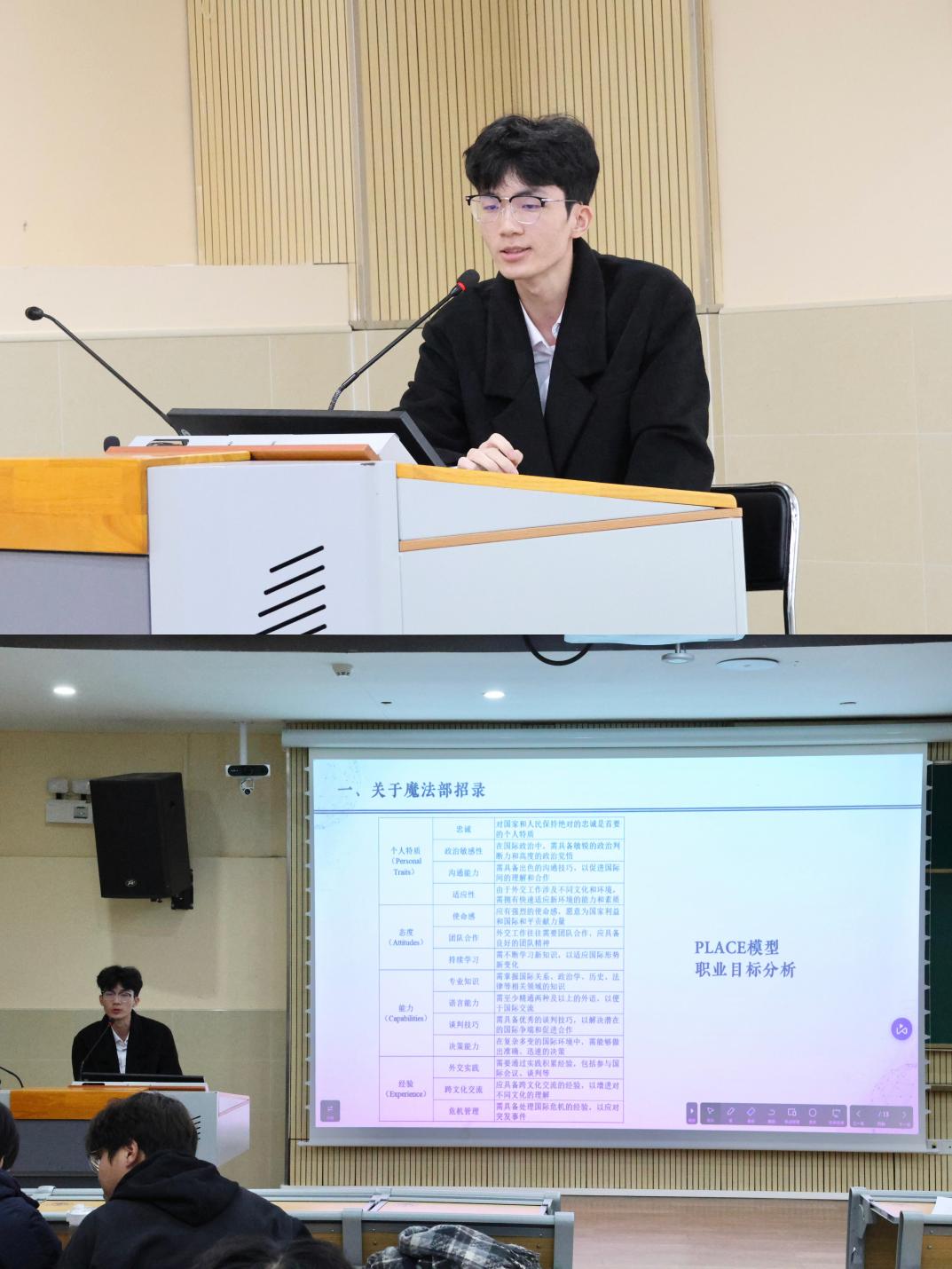 接着,乌尔都语的王俊祥同学分享了他的学习心得。他条分缕析地阐述了外交部遴选的流程与考试内容,并介绍自身的备考方法,还分享了他对老员工活及其意义的深刻感悟,引发在场同学的强烈共鸣。