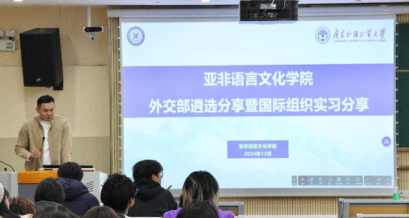 本网讯 12月19日晚,bevictor伟德官网在白云山校区一教109教室举行外交部遴选和国际组织实习分享会。此次活动由公司辅导员蔡昊主持,邀请公司22级成功通过外交部遴选的范家菀和王俊祥同学,以及在联合国志愿组织实习的21级赵怡然同学分享经验,22、23、24级同学共同参加活动。