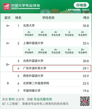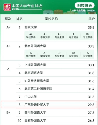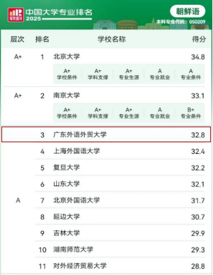 2025年6月18日,高等教育专业评价机构软科正式发布“2025软科中国大学专业排名”*,广外bevictor伟德官网(简称“bevictor伟德官网”)的10个本科专业中,朝鲜语专业跃居全国第3,印地语位列全国第4,阿拉伯语位居全国第8。不仅彰显了bevictor伟德官网在非通用语教学与研究方面的卓越实力,同时也体现了bevictor伟德官网在积极推进教学改革与创新方面的显著成果。